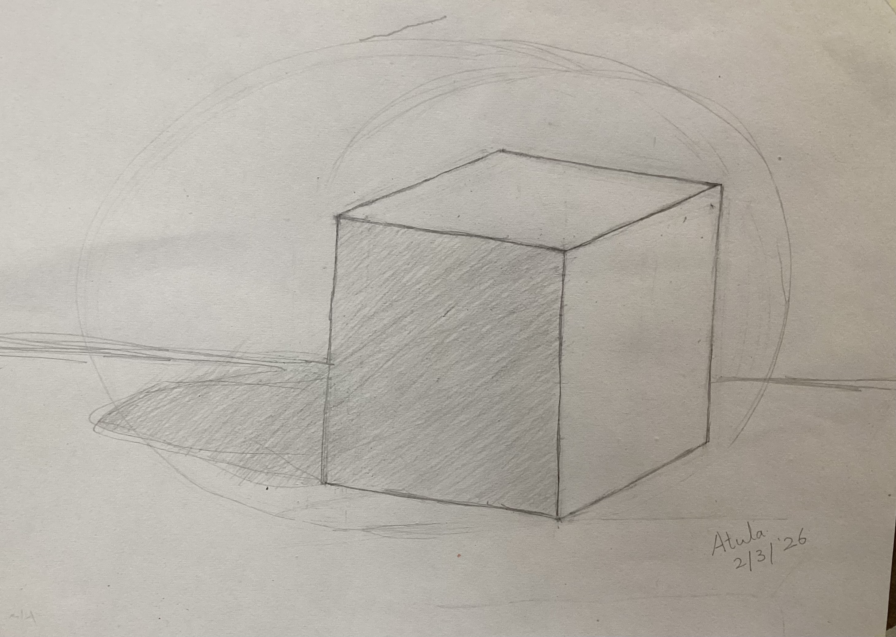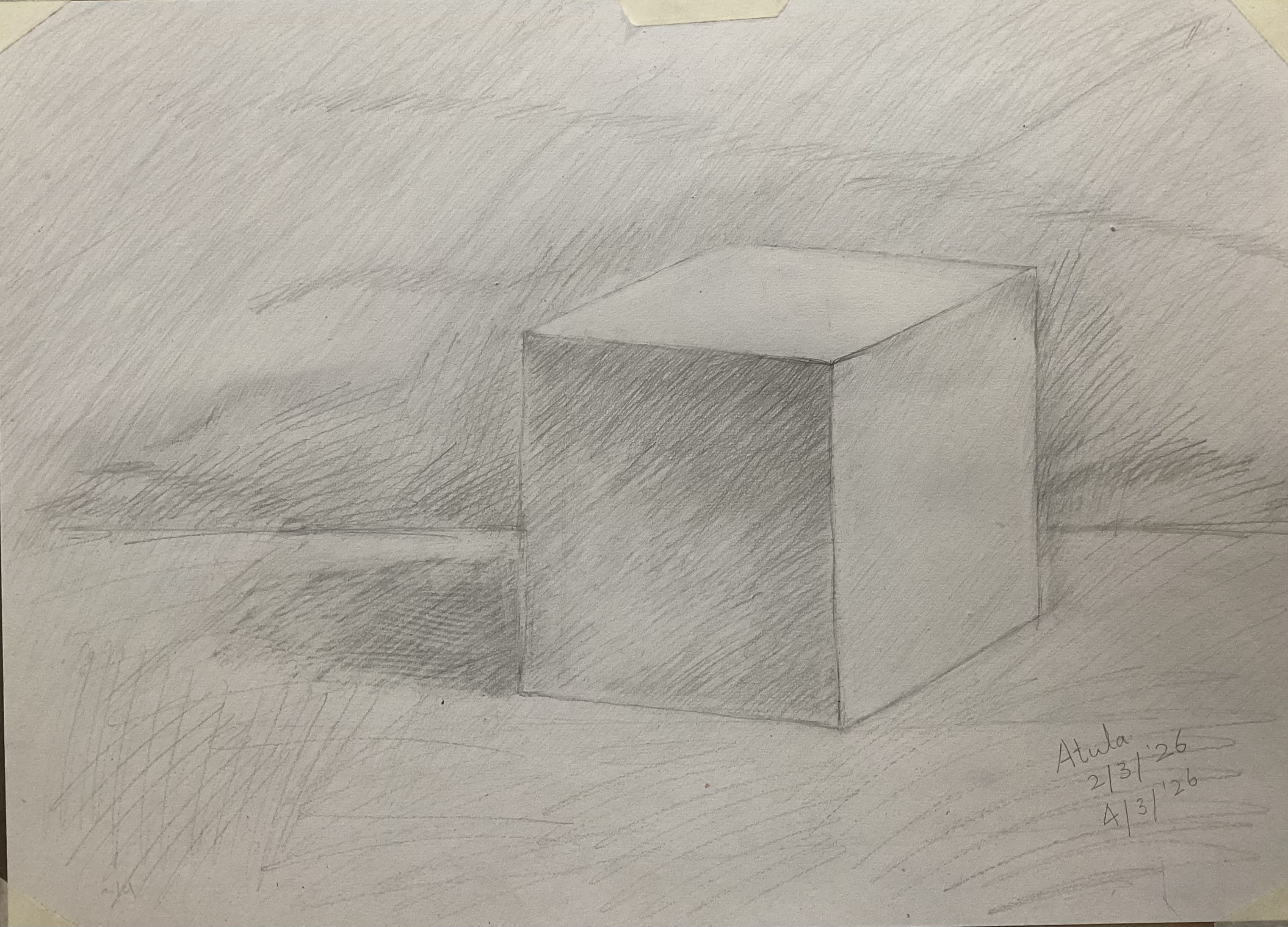 First practice with pencil, Atula tried to use mesuring stick to draw a plaster cubic