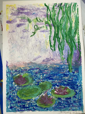 Today Bethany learned how to paint using an Impressionist technique. She did a study of Monet’s Water Lilies using oil pastels, and the result was amazing. She understood how artists observe light and adjust their colors accordingly.