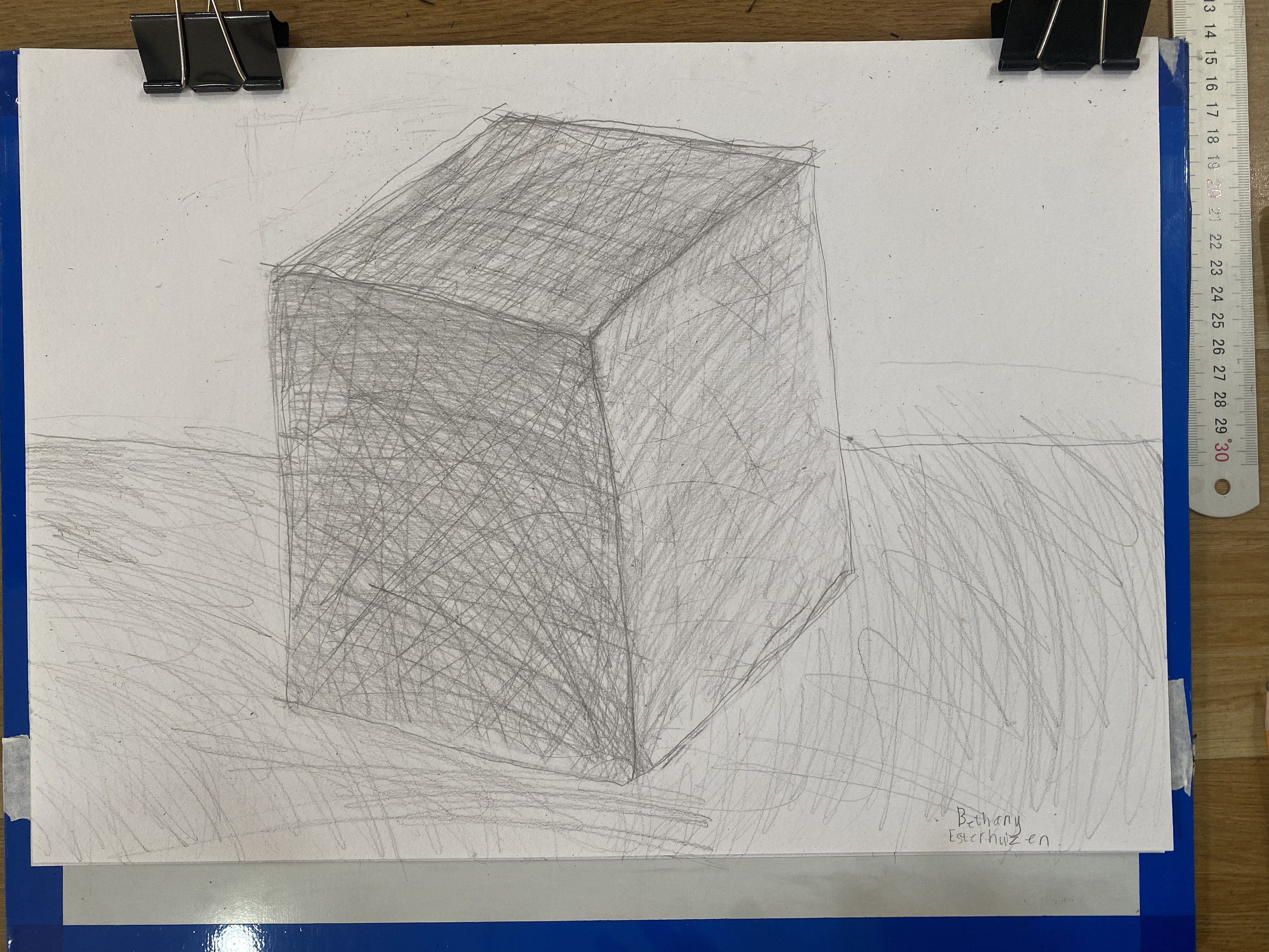 Sample session with Bethany – she learned basic cube drawing and how to arrange a composition on A3 paper. She still needs to work on values, but she learns quickly!