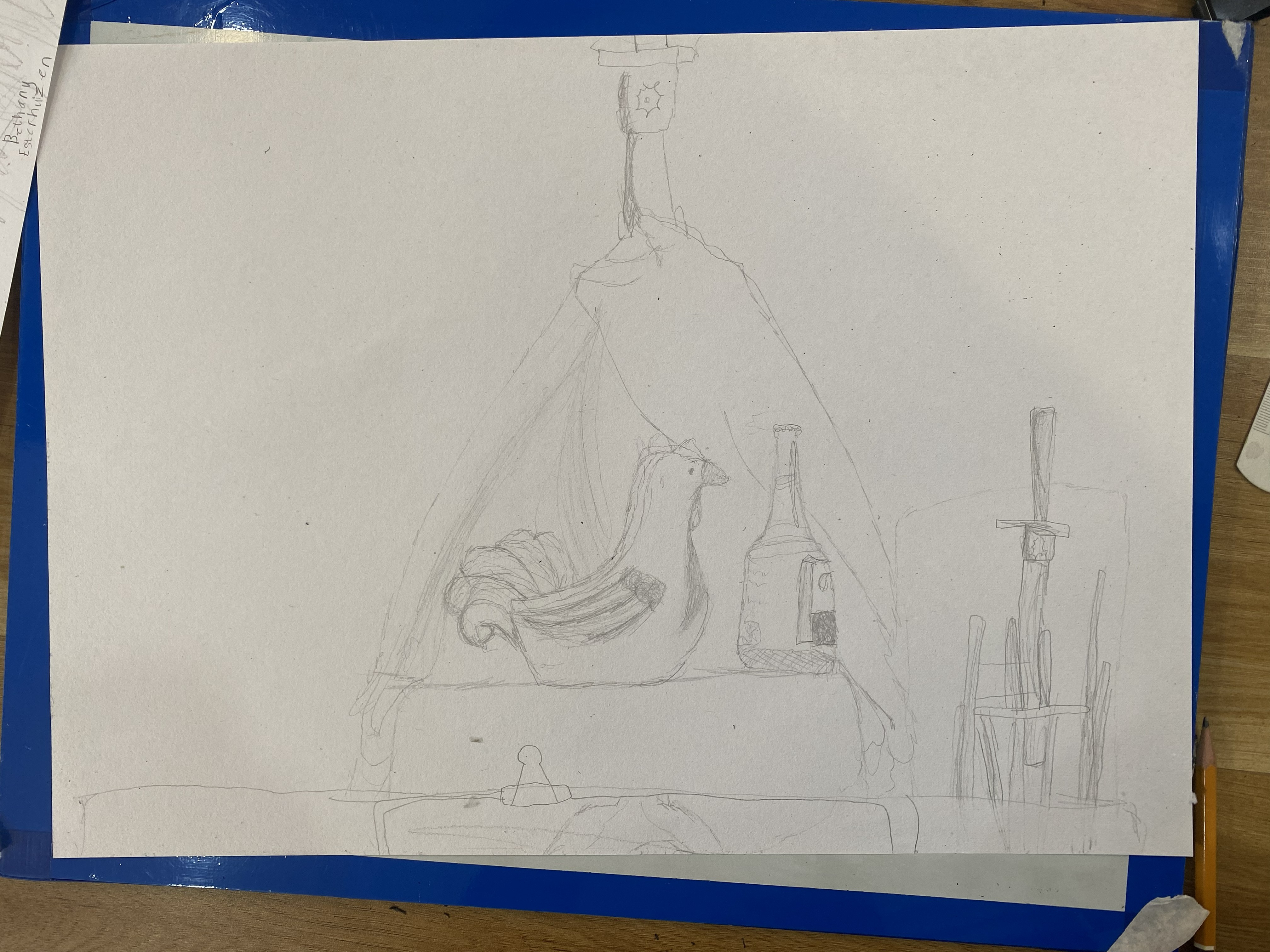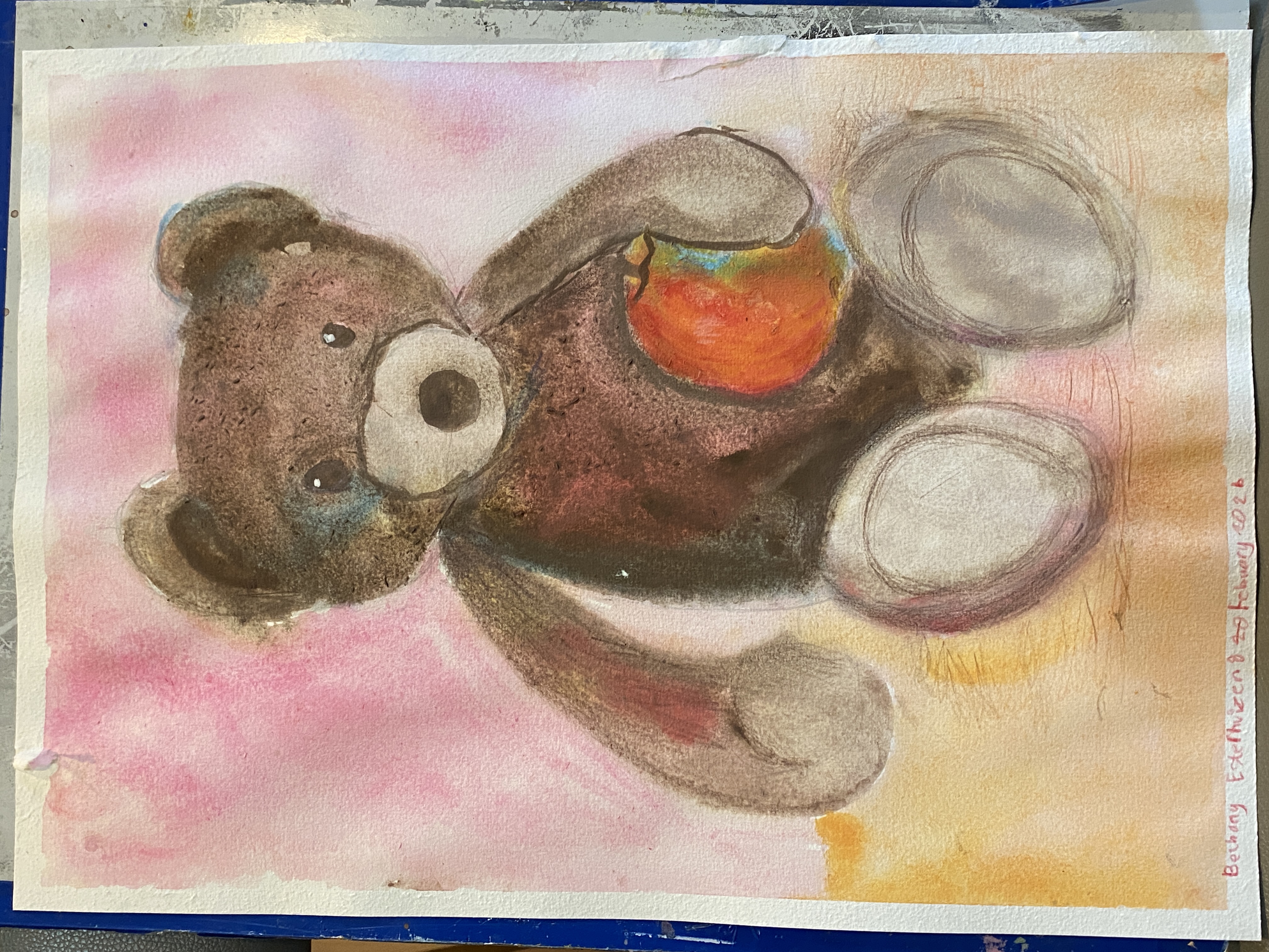 For her final sessions, we worked on a still life drawing of a teddy bear using pencil, then painted it with gouache. Bethany has developed a good eye for comparing proportions, and her progress has been really impressive. The pencil lines are now confident.
