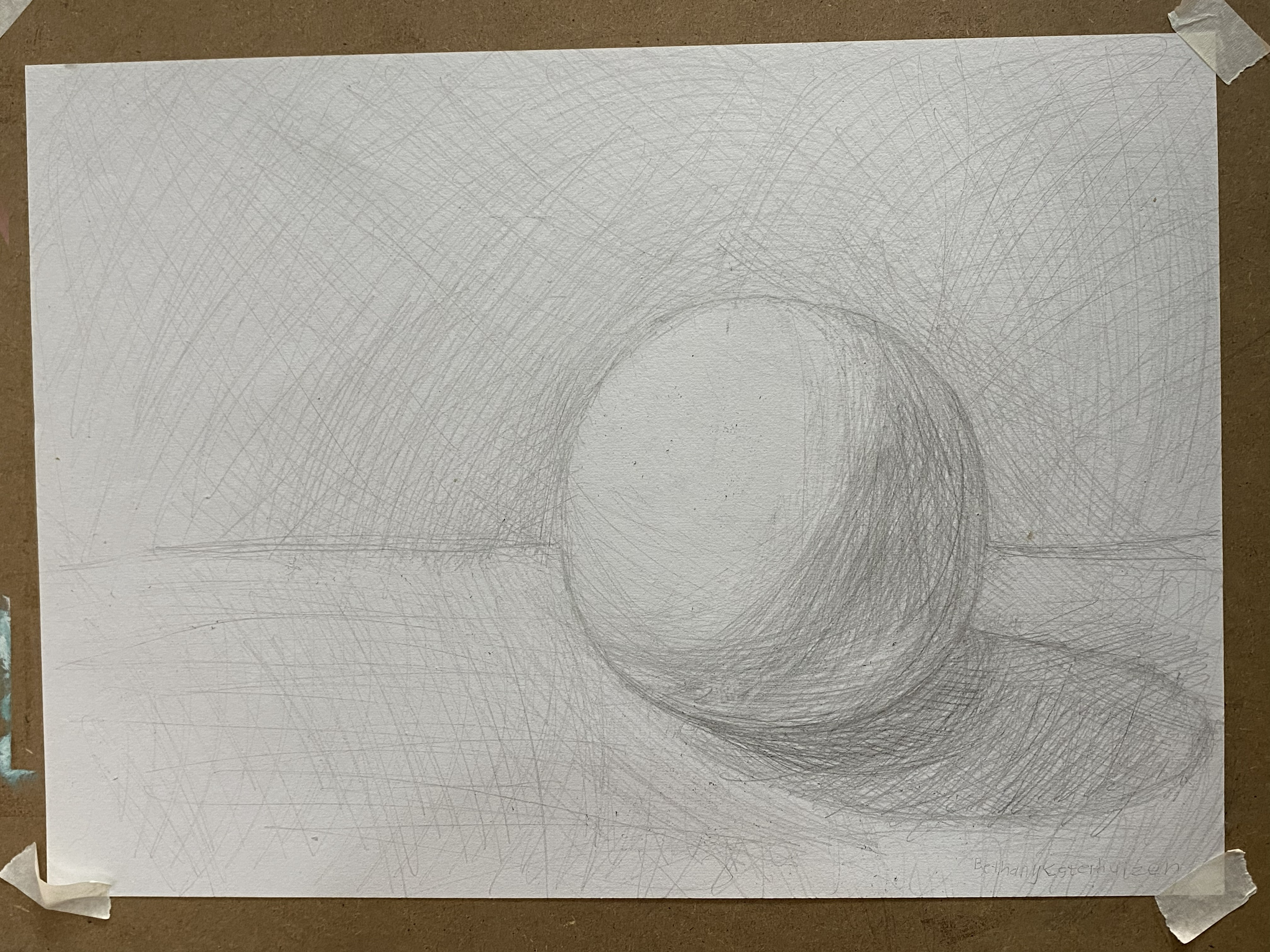Drawing a sphere: She learned how to make an “envelope” around the object. Her shading got better and she was more aware of the composition this time. Good job!