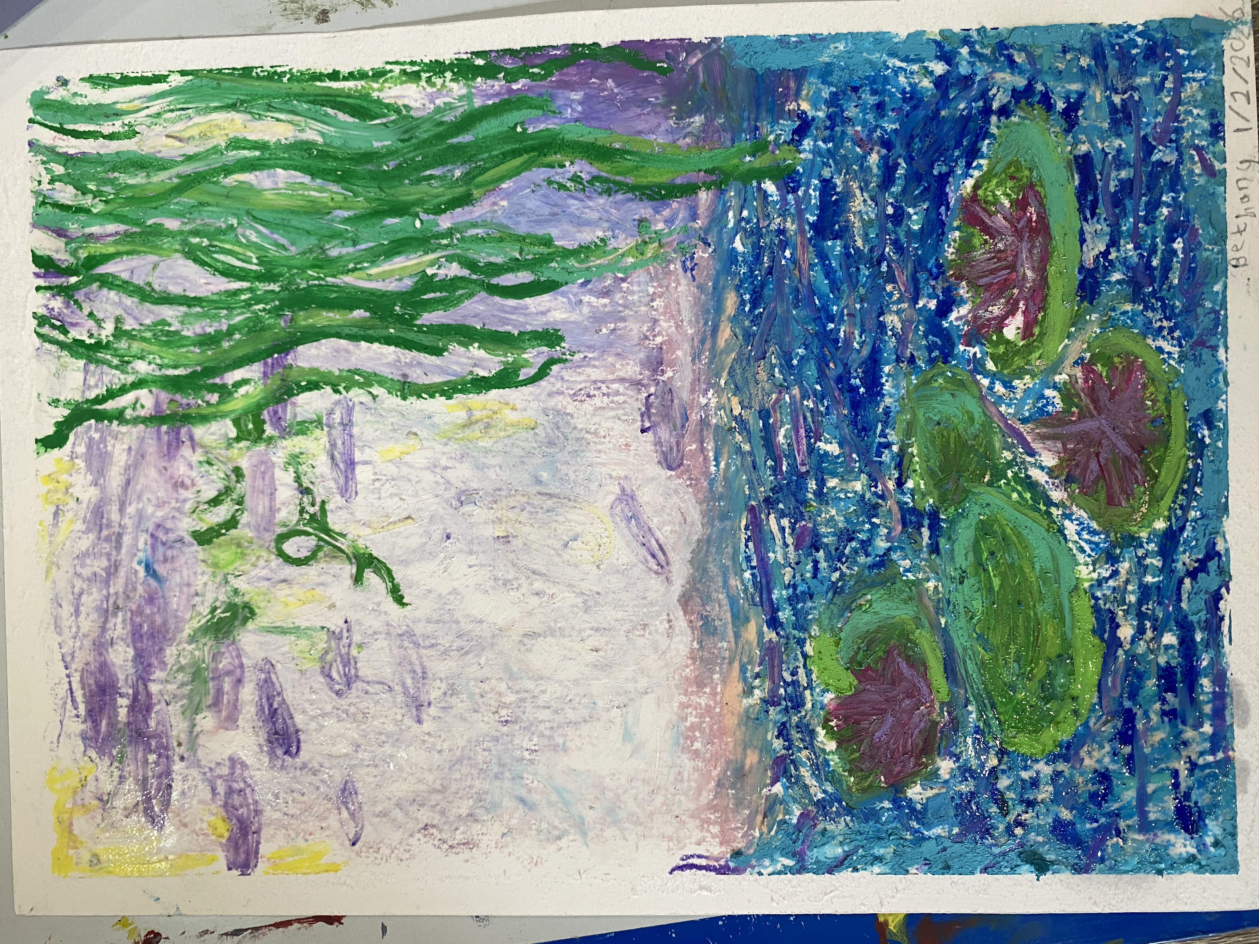 Today Bethany learned how to paint using an Impressionist technique. She did a study of Monet’s Water Lilies using oil pastels, and the result was amazing. She understood how artists observe light and adjust their colors accordingly.