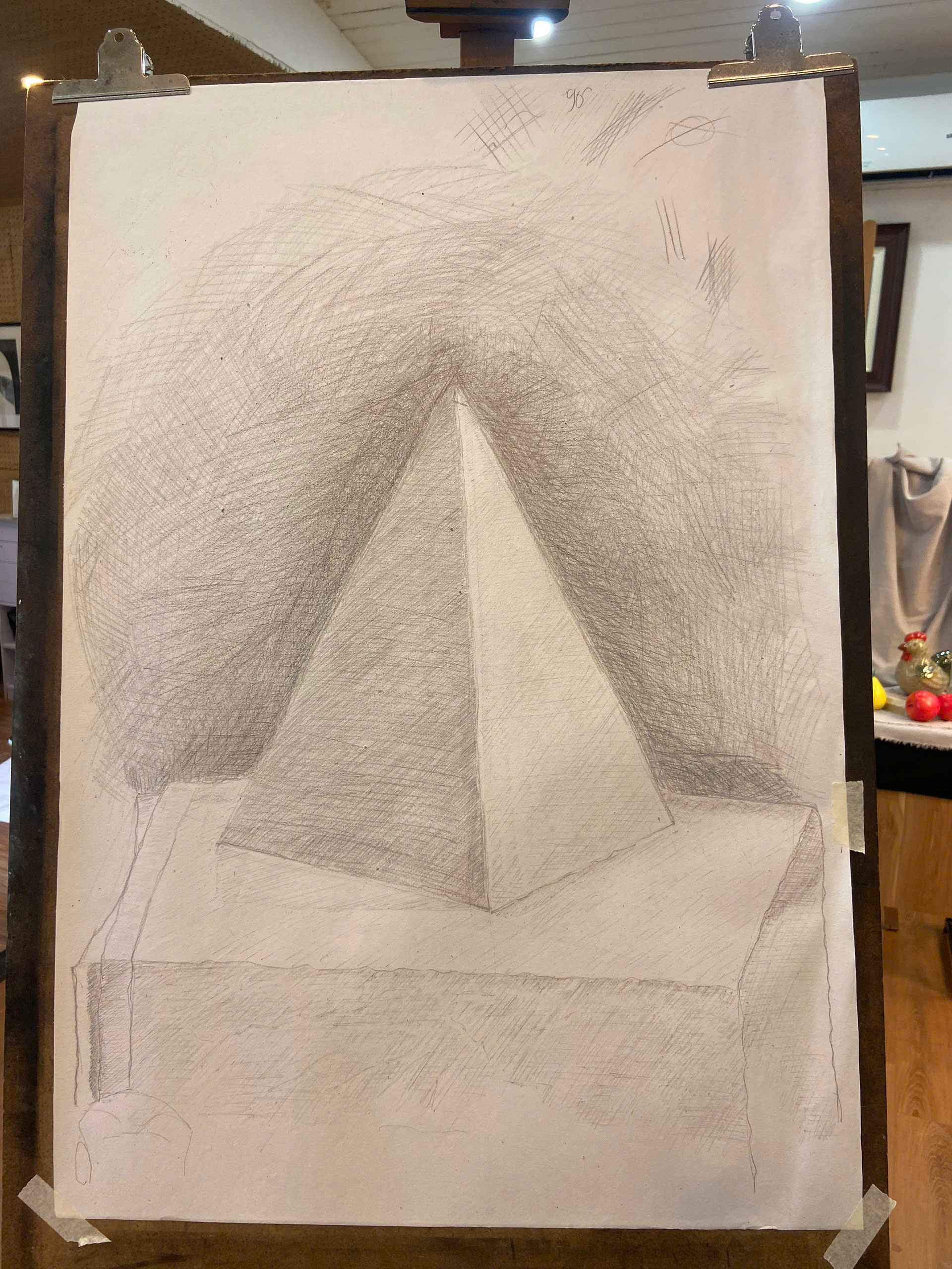 A more complex setup composed of two basic forms. The construction was quite quick and solid. He also learned more about how objects interact with light; however, his shading technique still needs improvement.